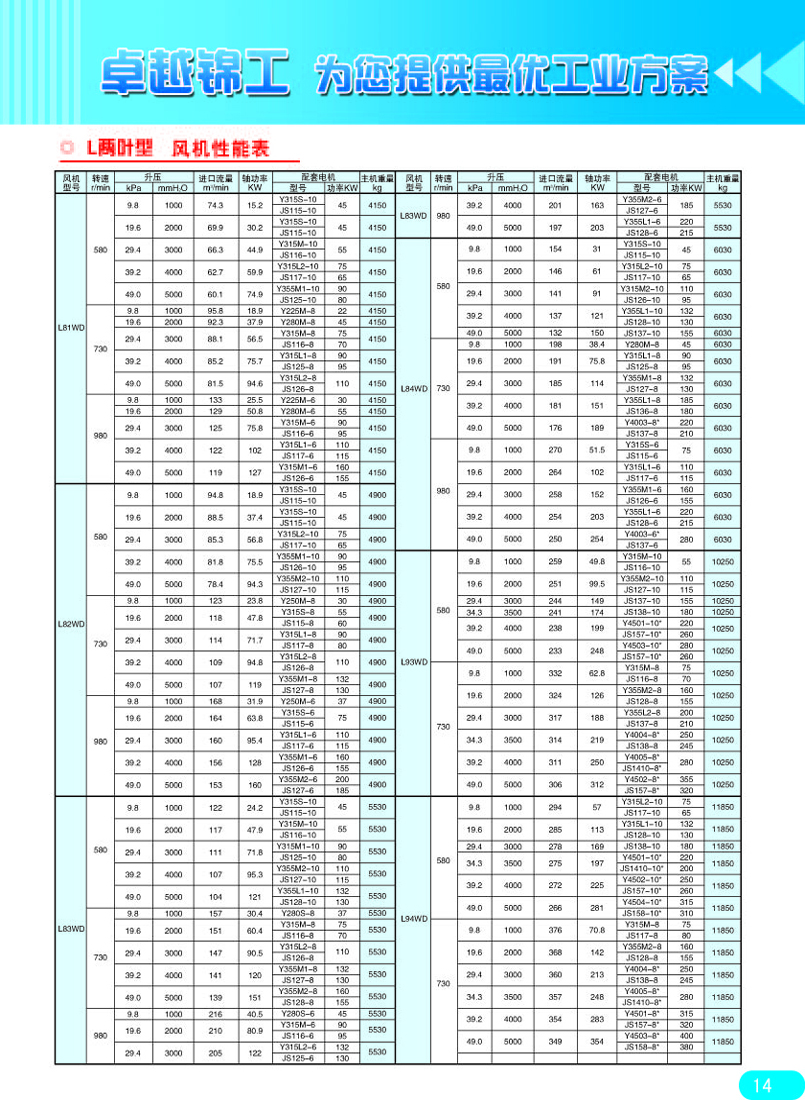 現(xiàn)在市場上的羅茨風(fēng)機(jī),很少再見到兩葉羅茨風(fēng)機(jī)了,現(xiàn)存兩葉羅茨風(fēng)機(jī)全是大風(fēng)量的,基本上都被三葉羅茨鼓風(fēng)機(jī)代替。但是在大流量條件下,兩葉羅茨風(fēng)機(jī)還是有市場的,附兩葉羅茨風(fēng)機(jī)參數(shù)表: