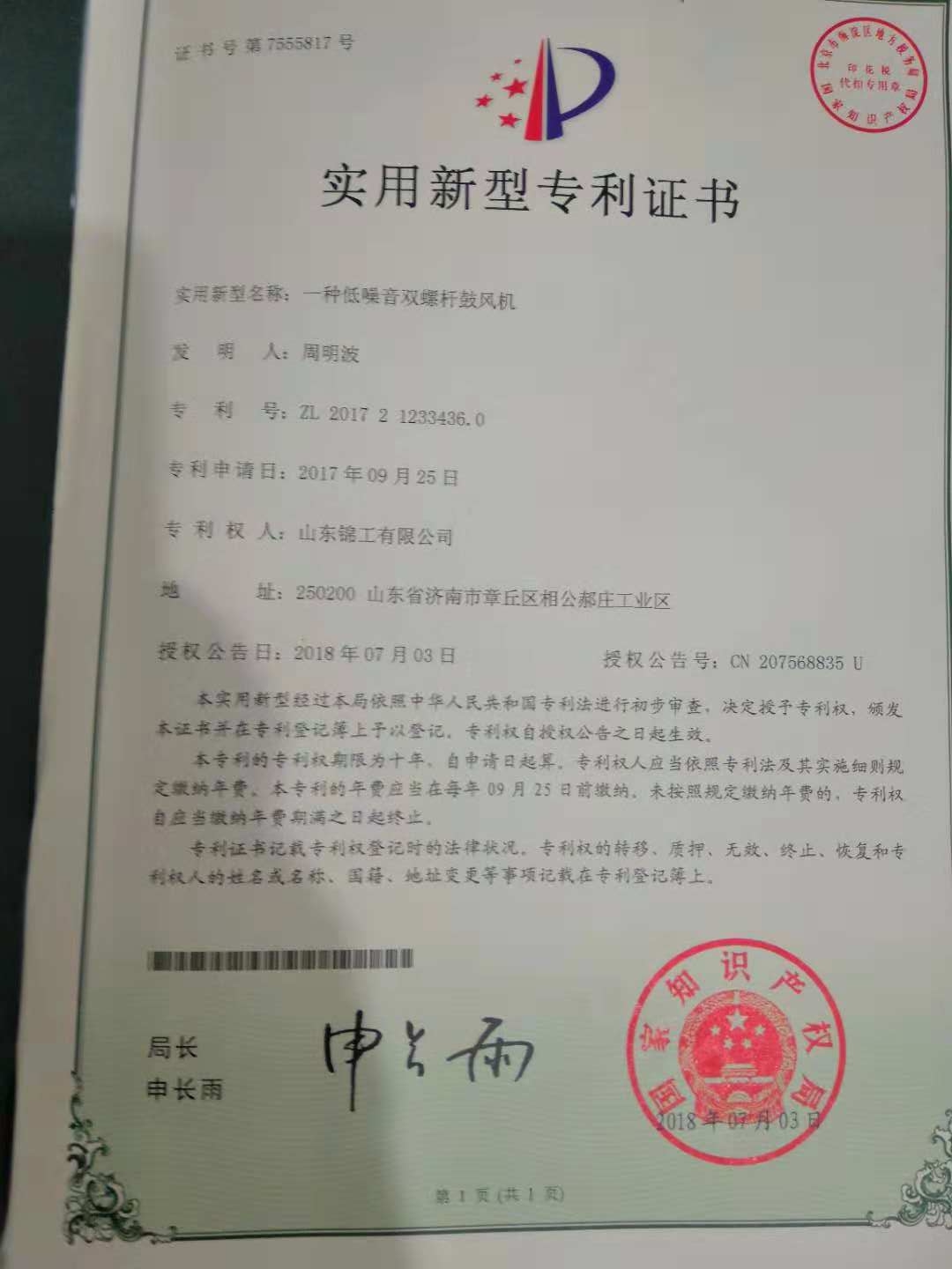 日前,錦工風(fēng)機(jī)的“一種雙螺桿鼓風(fēng)機(jī)” 、“一種緊湊型羅茨鼓風(fēng)機(jī)” 、 “羅茨風(fēng)機(jī)選型軟件” 等獲國(guó)家知識(shí)產(chǎn)權(quán)局頒發(fā)的專(zhuān)利及軟著證書(shū)。