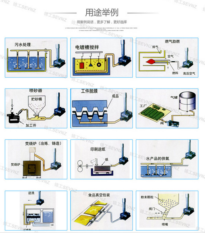 污水曝氣處理:羅茨鼓風機的作用,主要是為水體中的好氧菌提供充分的溶解氧,為攪動曝氣池中的混合液提供動力;常用于:造紙、紡織.印染、電鍍、粘膠纖維、石油化工、食品加工、發(fā)酵釀造等工業(yè)廢水及城市生活污水的曝氣處理。在選用風機時,風壓取決于水深、管道阻力和水的粘度,風量取決于水的體積。常用的機型: JGR-65、JGR-80、JGR-100等。