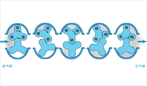 三葉轉(zhuǎn)子羅茨鼓風(fēng)機(jī)的振動(dòng)和噪聲比二葉的小, 在三葉轉(zhuǎn)子上使用的軸承的壽命比在二葉上使用的長(zhǎng) 15% 左右。而且三葉轉(zhuǎn)子可以采用扭葉轉(zhuǎn)子來(lái)降低其噪聲和振動(dòng), 二葉轉(zhuǎn)子由于結(jié)構(gòu)上的限制不能采用扭葉結(jié)構(gòu)。
