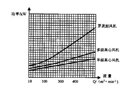 三種風機的能耗對比見:三種風機流量—功率曲線圖(見圖1) 。在流量較小時,三種風機效率差異不是很顯著;對于大流量風機,由于羅茨式轉速無法提高,效率較低;另兩種離心風機差距較小。