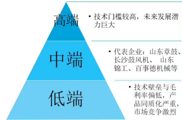 我國羅茨鼓風(fēng)機行業(yè)競爭較為充分,市場化程度較高。目前已經(jīng)形成了高、中、低三個層次產(chǎn)品市場。低端產(chǎn)品市場技術(shù)壁壘與毛利率偏低,市場競爭激烈。中端產(chǎn)品市場主要企業(yè)有長沙鼓風(fēng)機、山東章鼓、百事德機械、錦工鼓風(fēng)機等。高端產(chǎn)品市場技術(shù)門檻較大,未來發(fā)展?jié)摿薮螅彩窃S多企業(yè)未來的發(fā)展方向。